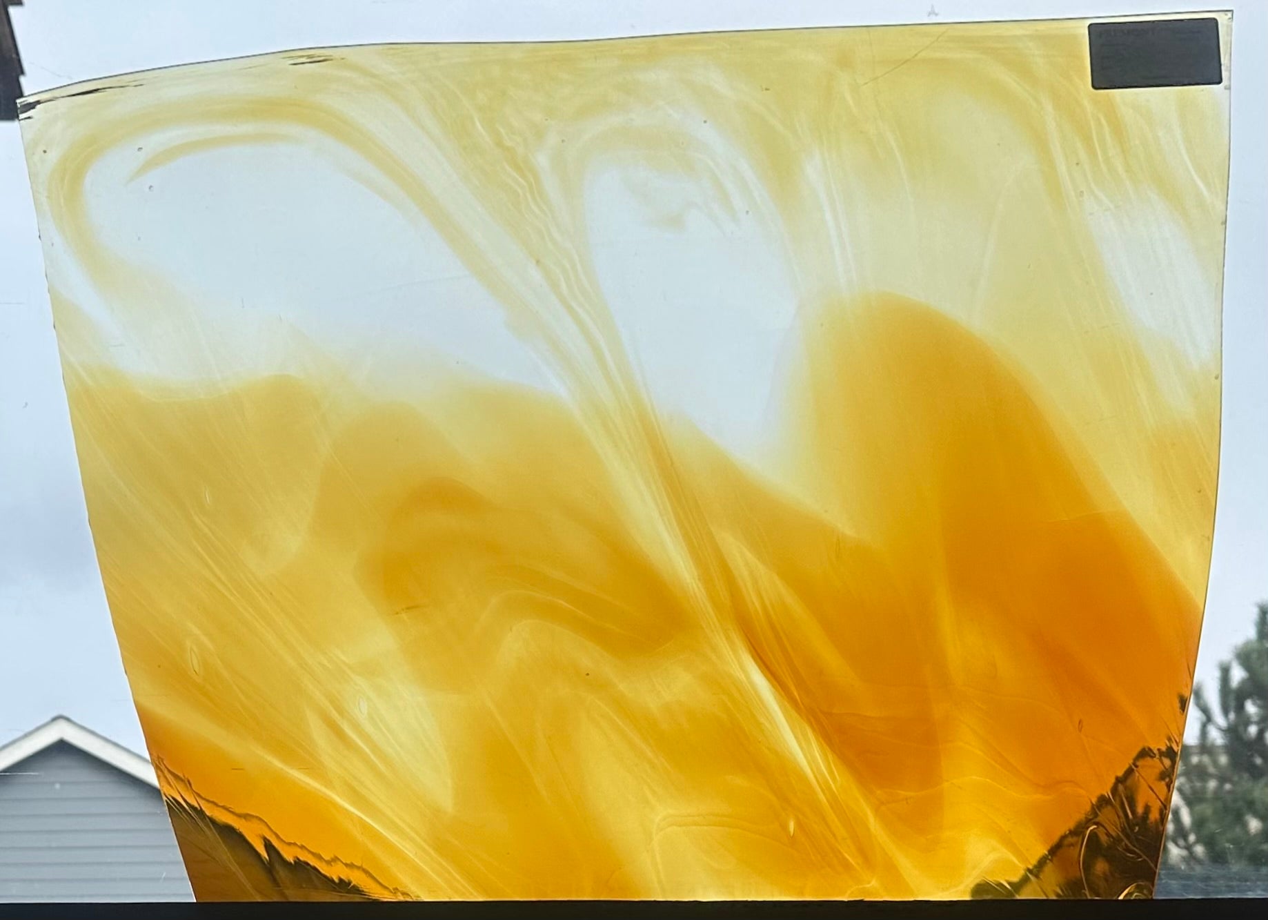 Transparent Amber swirl. Full sheets are shipped in boxes or by crate order. Sheets can be cut in half to save on shipping costs. Crates hold a minimum of 10 sheets and max of 38. Crating fee is $75 plus freight.