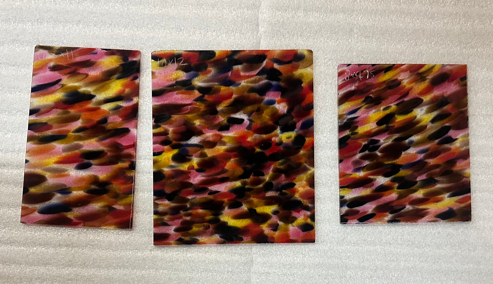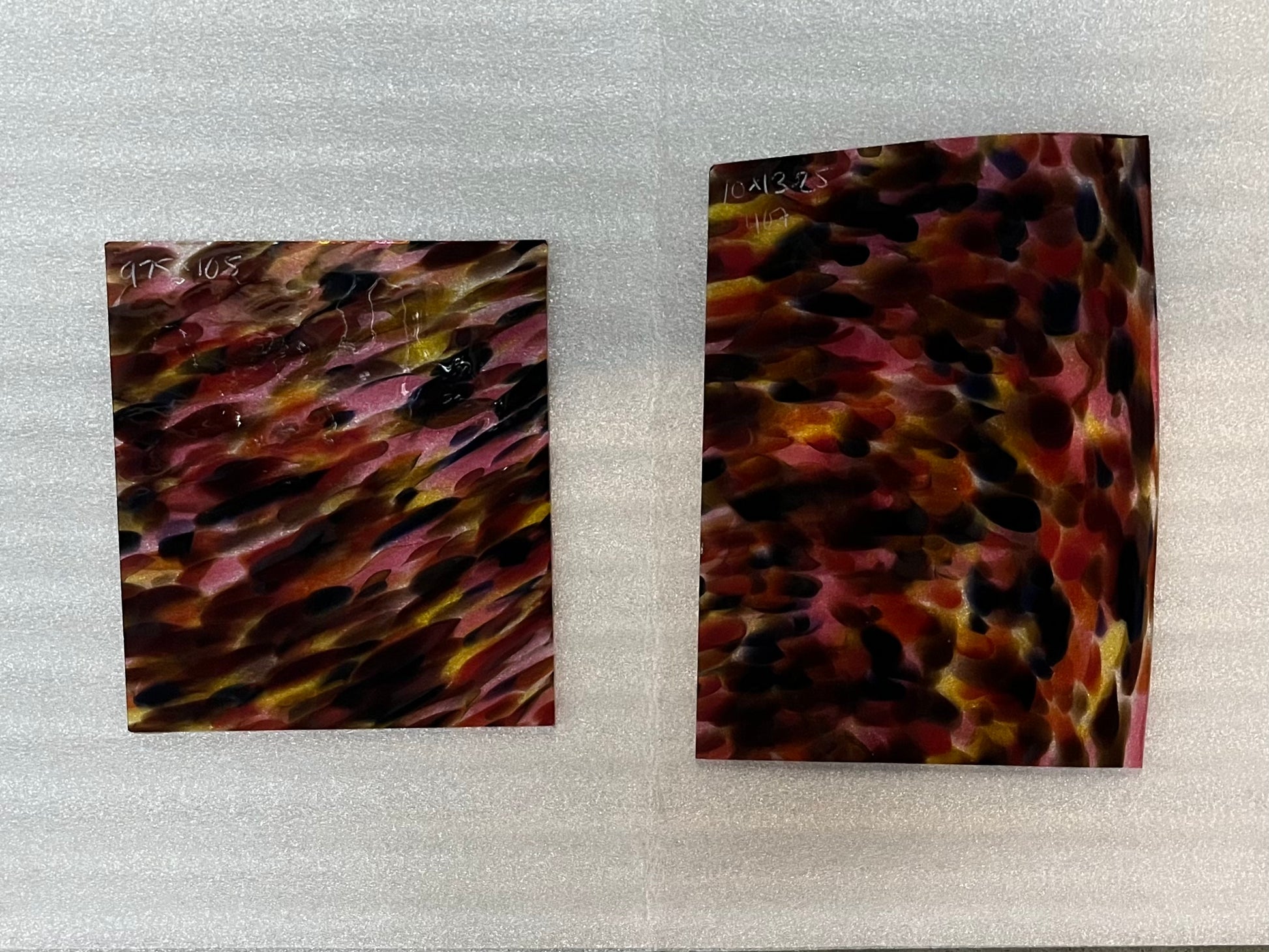 Transparent P1 407 red, copper, purple and flecks of pink.